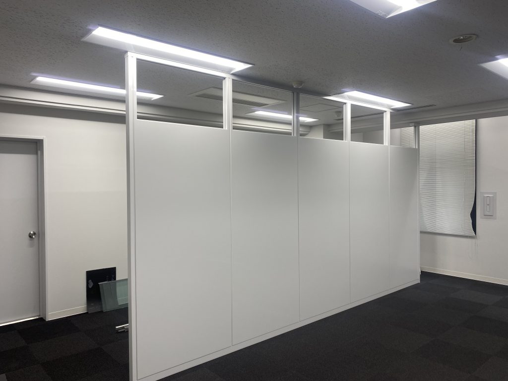 グラスウールも入れて防音対策をしたスチールパーテーション施工致しました。巾木の中まで入れています。
